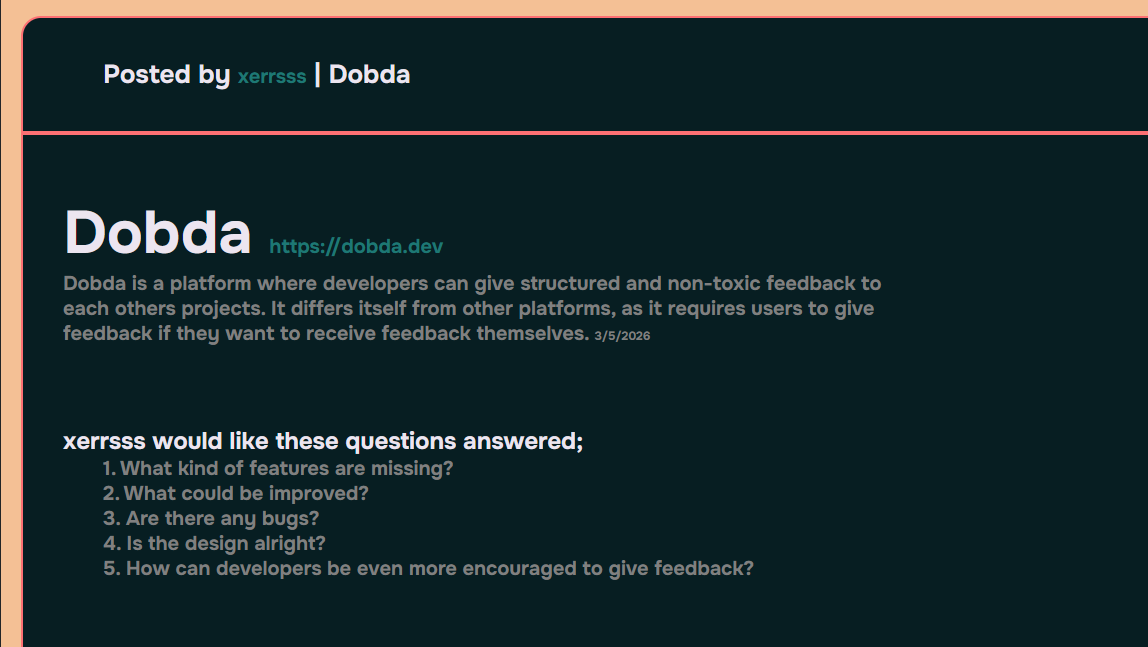 Dobda is a platform where solo developers share their projects and get structured, actionable feedback.